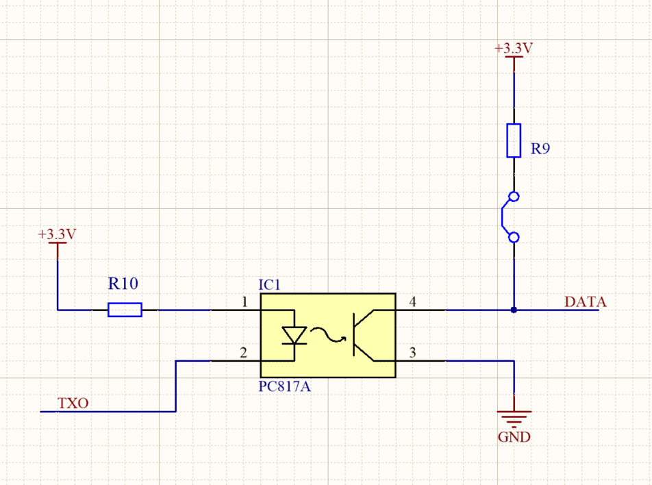 - R10 = 100 Ohms and R9 = 220 Ohms. Signal not completely pulled to 0V. However, we are having a cleaner signal this time, capable to be read from the oscilloscope.