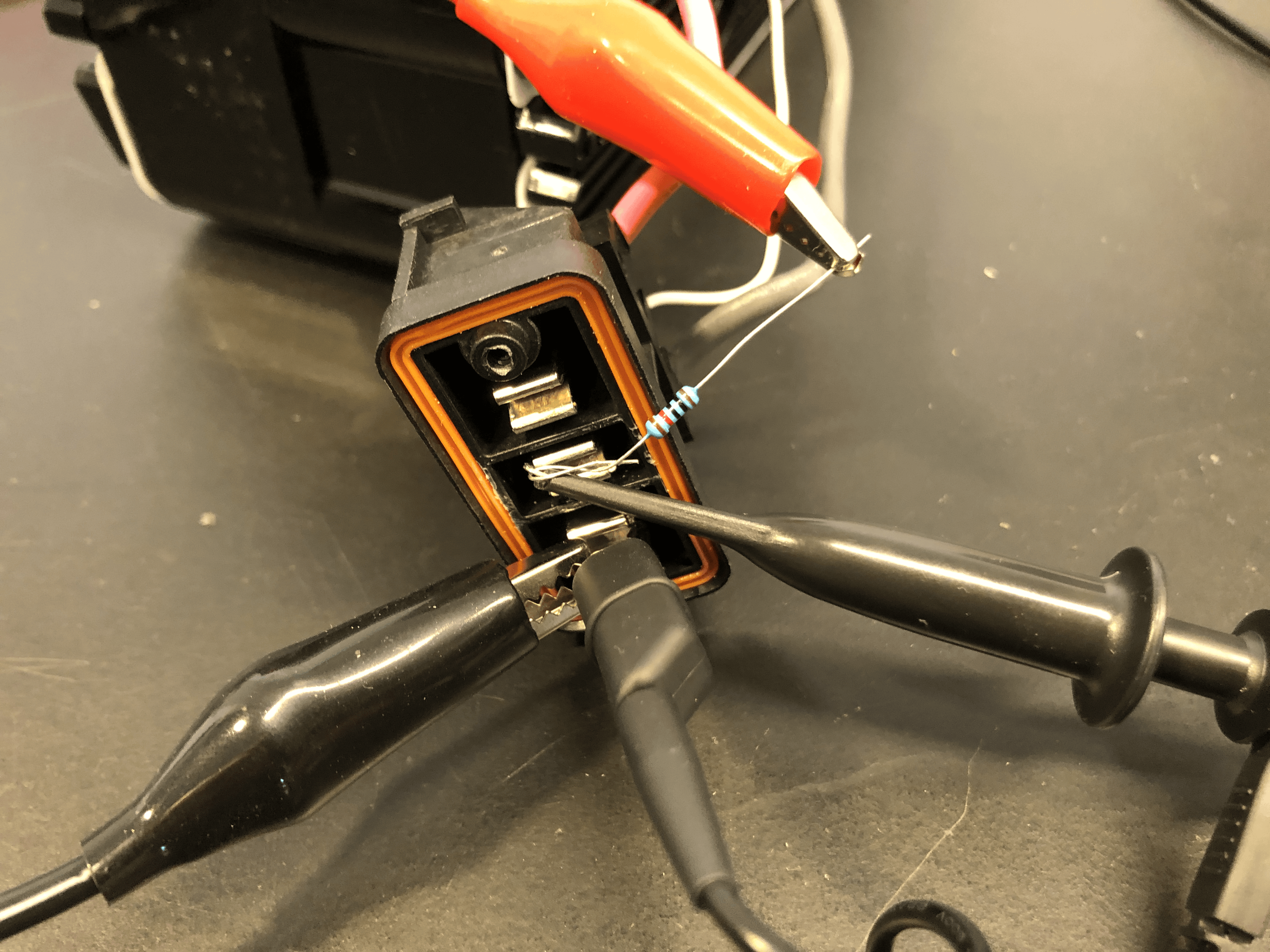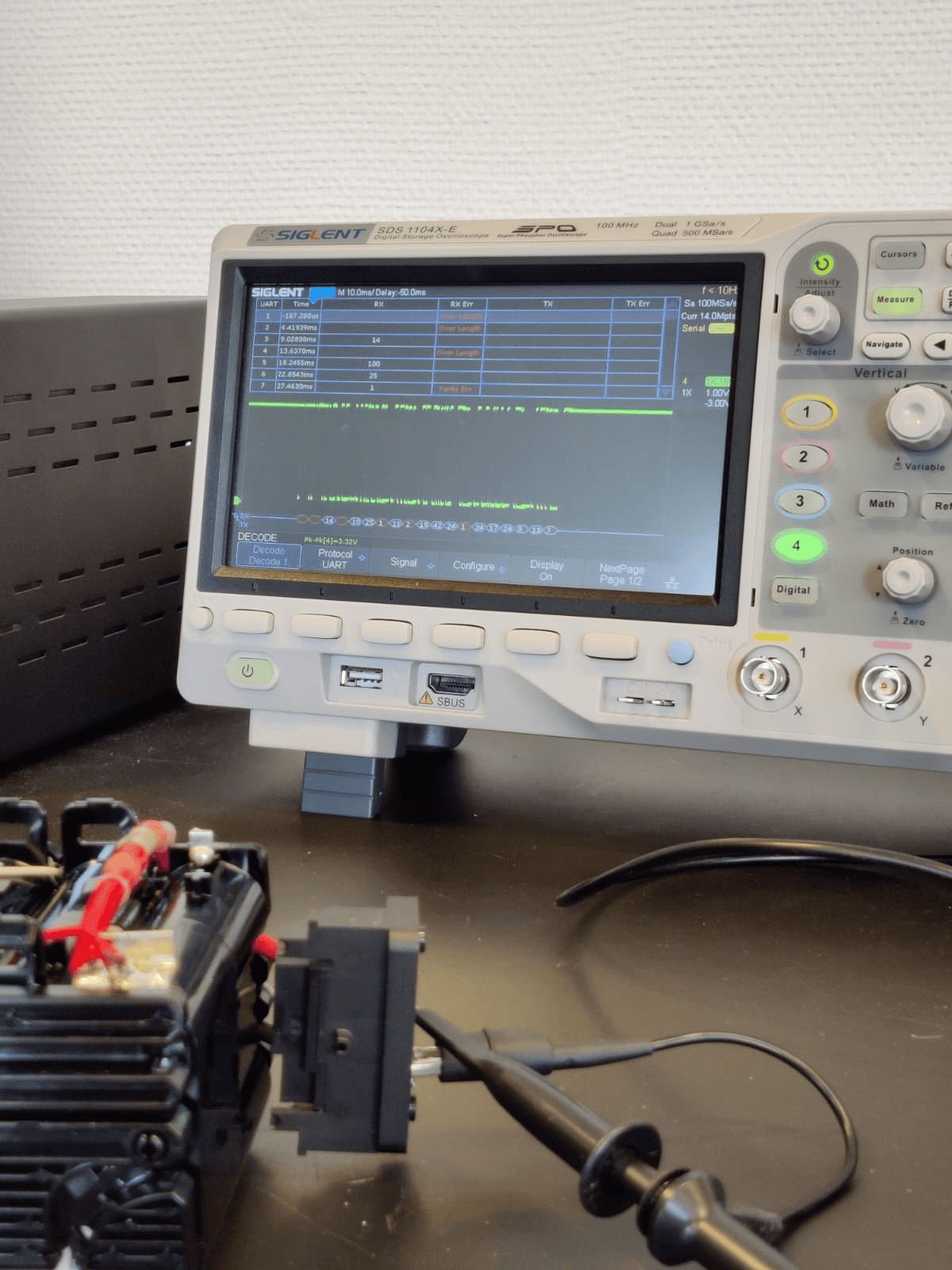 Measuring in the connector (Data pad), error messages are visible at the scope