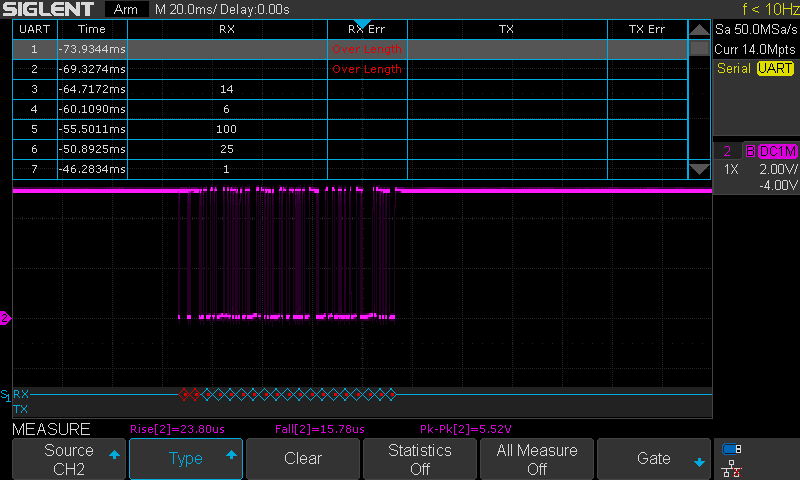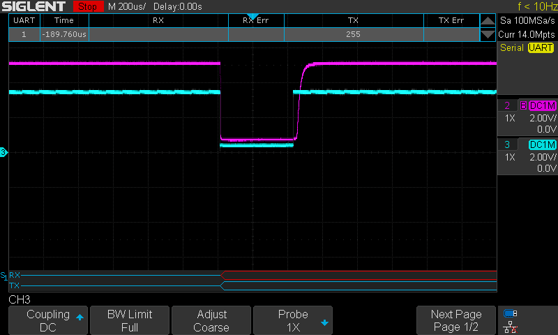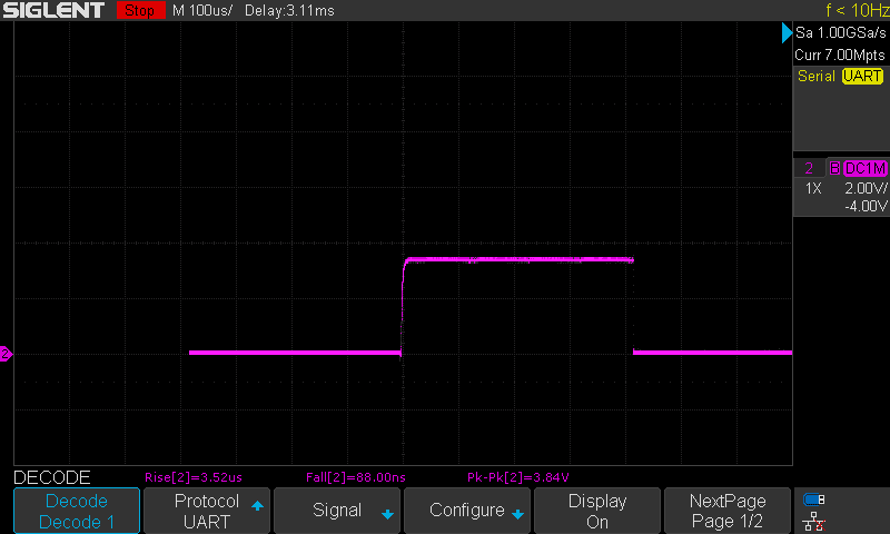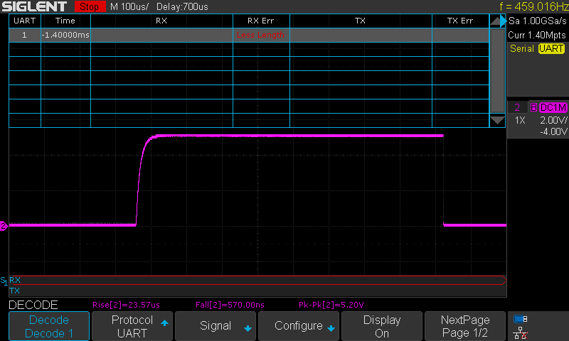 Adding a 470 Ohm resistor in series with the data pin made the signal a lot more 'square'. But still not good enough, and hence the problem. Even the scope can't decode it! Too slow rise time. Below the screenshots compare the output and the input of the optocoupler.